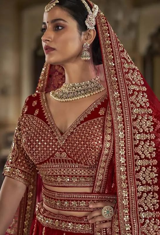 Step into timeless elegance with this crimson red bridal lehenga, designed to make every bride shine with regal grace. The lehenga is richly adorned with zari, resham, and sequin embroidery, featuring grand paisley and floral motifs that bring an aura of opulence.